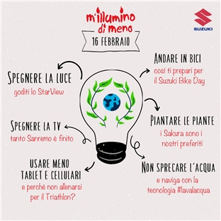 Spegnere le luci per accendere i riflettori sul tema della gestione efficiente dell’energia e di una vita quotidiana attenta all’ambiente. È questo il senso della campagna “M’illumino di meno”, che si svolge oggi, giovedì 16 febbraio, nell’ambito della Giornata del Risparmio Energetico e degli Stili di Vita Sostenibili e alla quale Suzuki e la sua rete di Concessionari aderiscono per il terzo anno consecutivo.