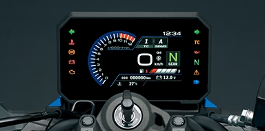 La GSX-8S è equipaggiata con uno schermo TFT LCD a colori da 5”. Il display ad alta risoluzione fornisce informazioni chiare e facilmente leggibili sullo stato della moto e sulle impostazioni dei vari sistemi. Oltre alla velocità, il tachimetro mostra un indicatore luminoso programmabile del numero di giri che lampeggia quando il motore raggiunge un regime prestabilito. Lo schermo visualizza inoltre avvisi e avvertimenti a comparsa.