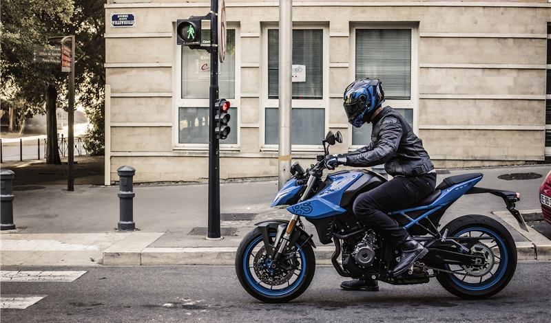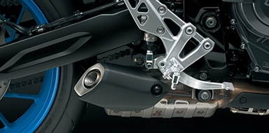 La GSX-8S è dotata di un nuovo scarico corto posizionato in basso sul lato destro del motore e contribuisce notevolmente al look compatto di questa street fighter. L’impianto di scarico 2-in-1 produce un sound piacevole che si addice perfettamente al nuovo motore bicilindrico parallelo. Inoltre, il convertitore catalitico a doppio stadio contribuisce a soddisfare la normativa Euro 5+ sulle emissioni, massimizzando al contempo la potenza erogata e le prestazioni complessive.