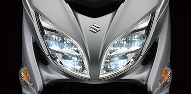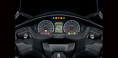 La spia Suzuki Eco Drive* si illumina quando si utilizza lo scooter con un’andatura attenta ai consumi e può aiutare il pilota ad apprendere tecniche di guida utili a risparmiare carburante. L’indicatore del traction control segnala al pilota quando il sistema è attivo, mentre quello del cambio dell’olio ricorda di effettuare la manutenzione periodica con un certo anticipo.